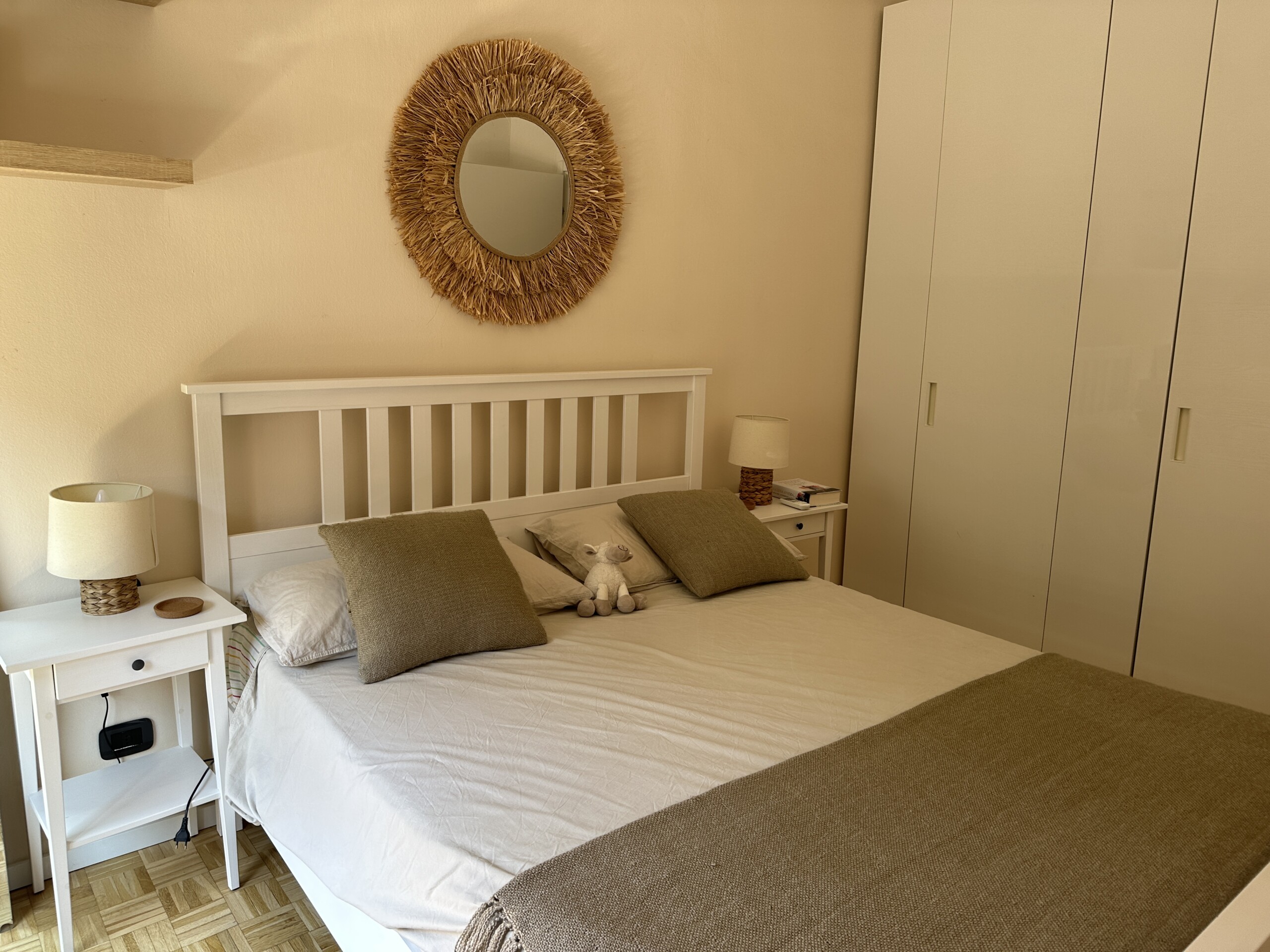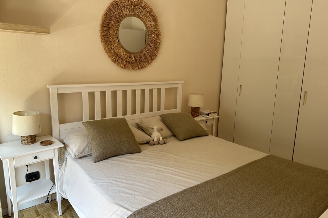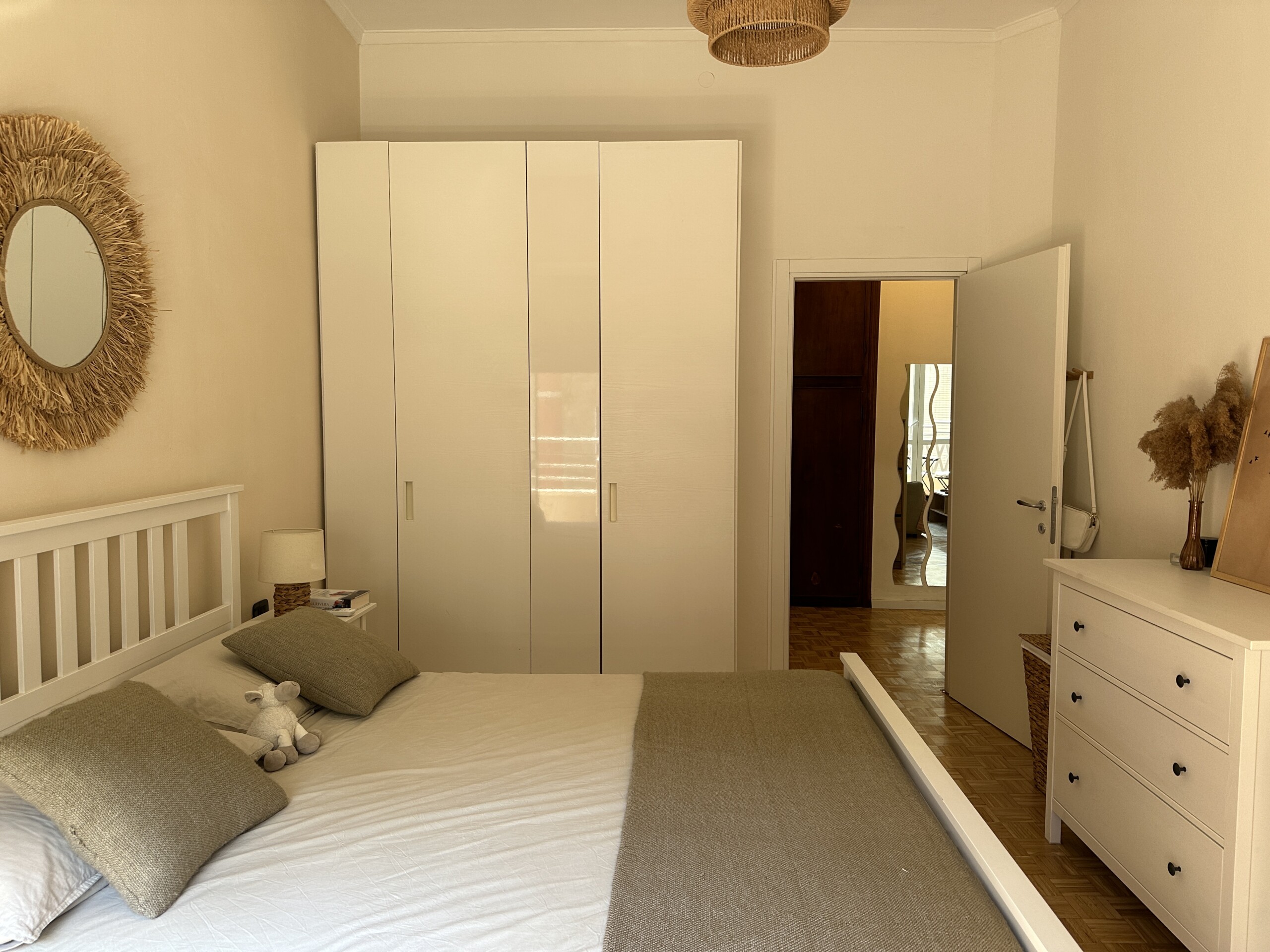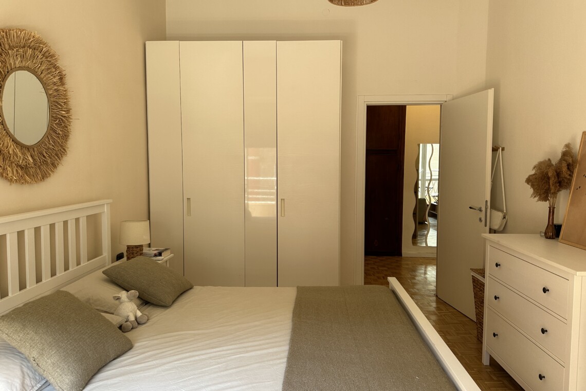 Airy bedroom with a double bed, a desk and a large wardrobe.