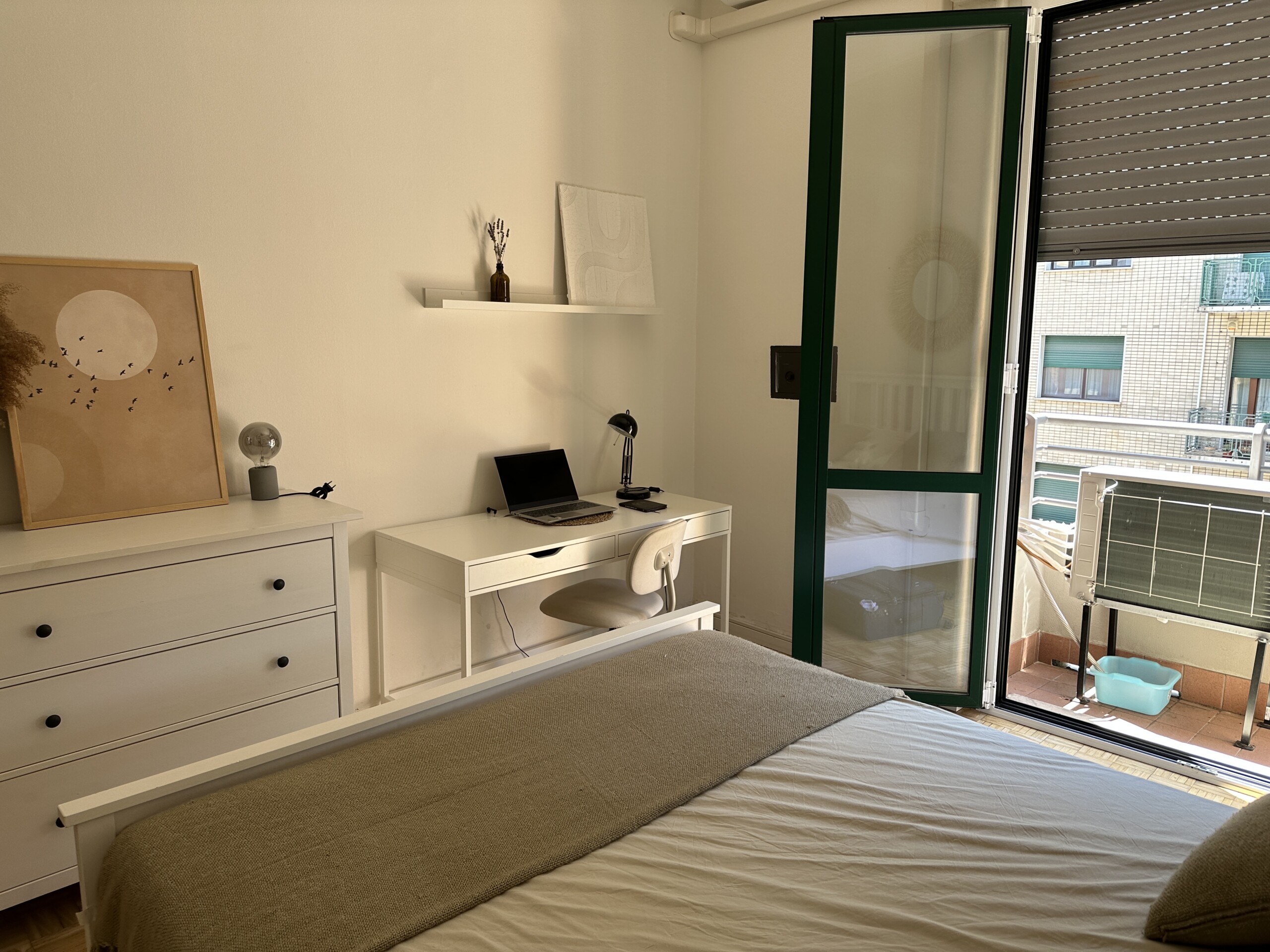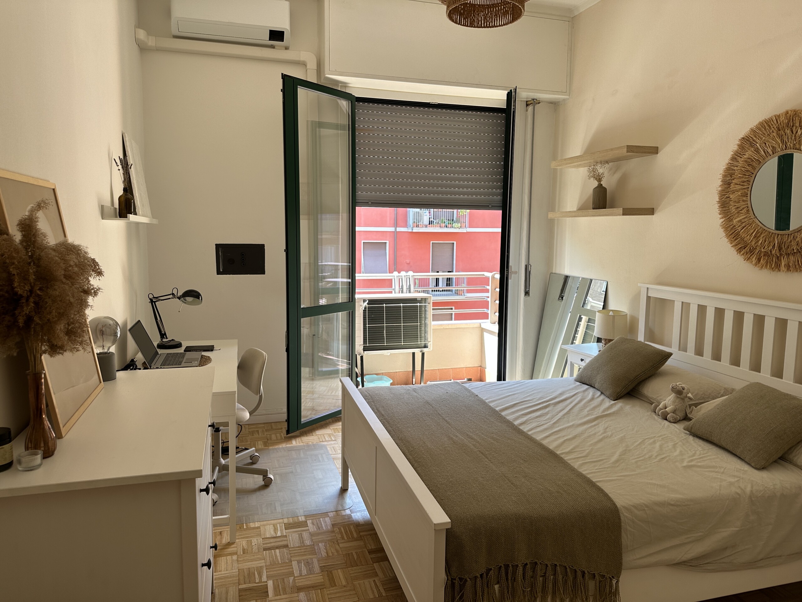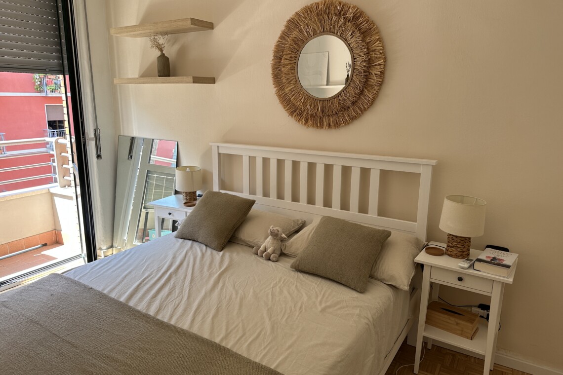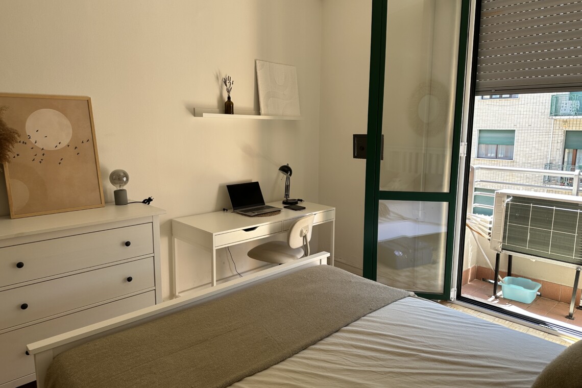 Airy bedroom with a double bed, a desk and a large wardrobe.