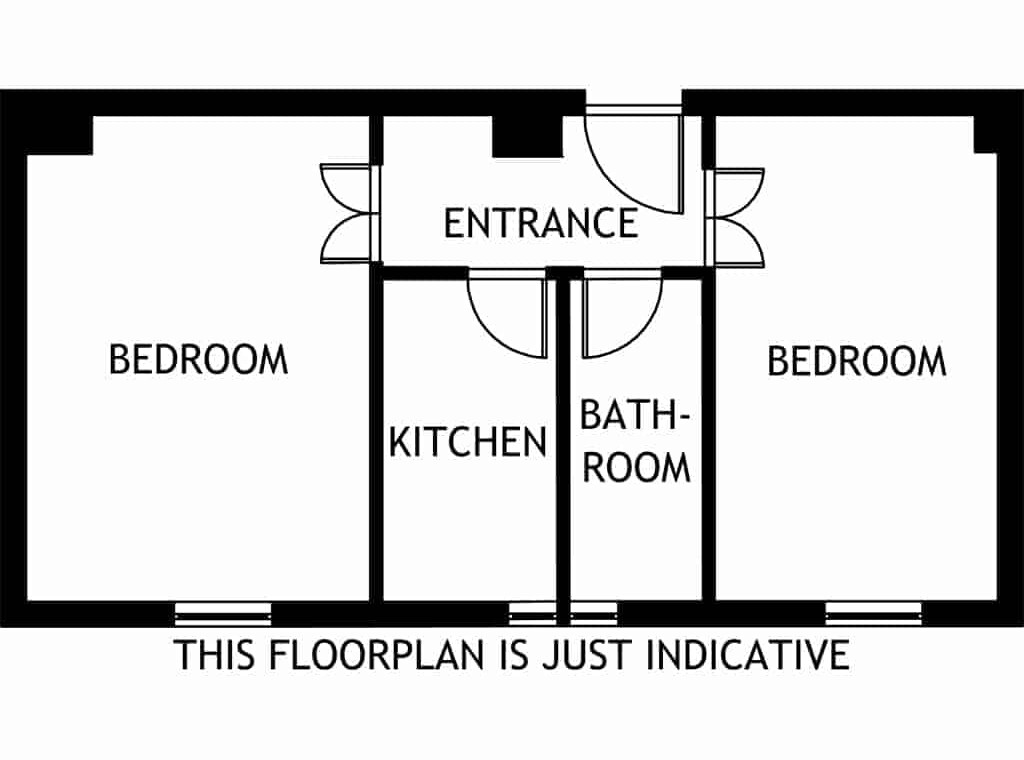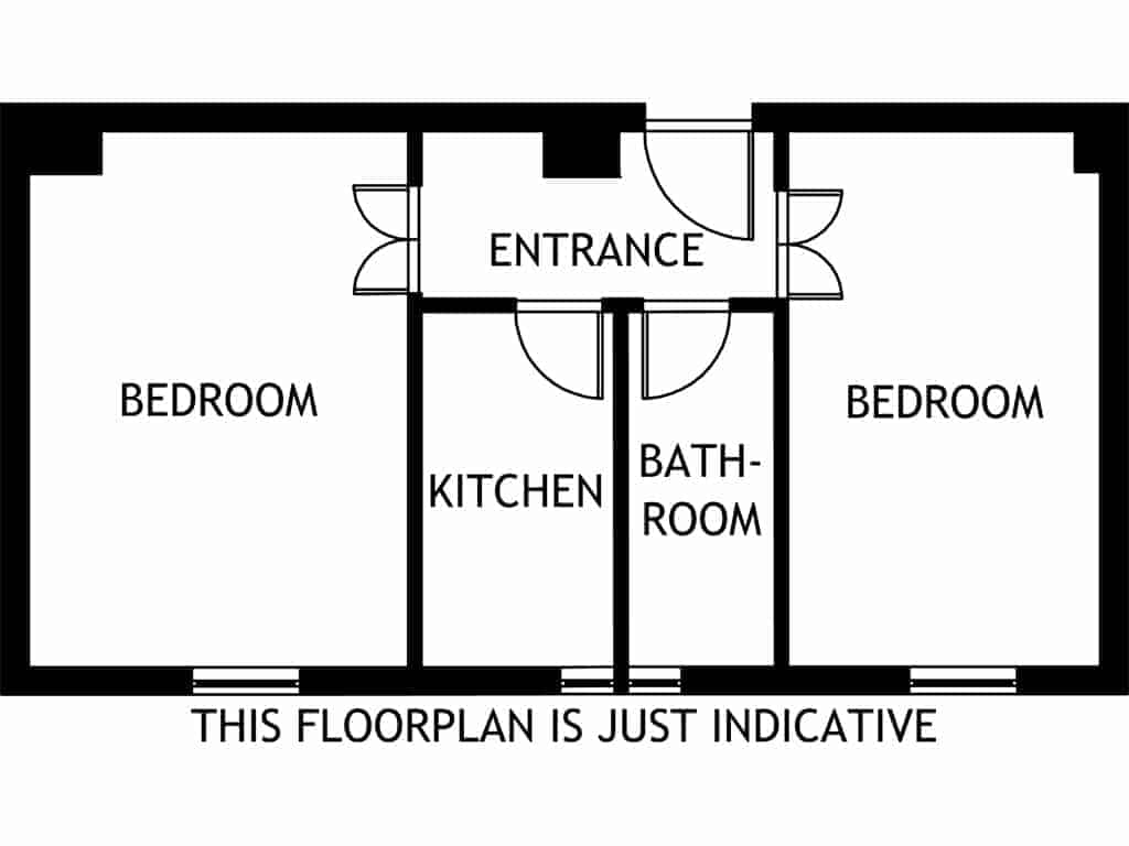 The apartment opens onto an entrance hall. On the right, there is a spacious bedroom furnished with a single bed and a queen-size bed (140 cm wide), a desk, a large wardrobe, a TV, and a dryer.