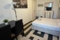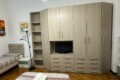 On the left side of the apartment, you will find the second bedroom, furnished with a double bed, a desk, a spacious wardrobe, and a TV.