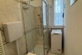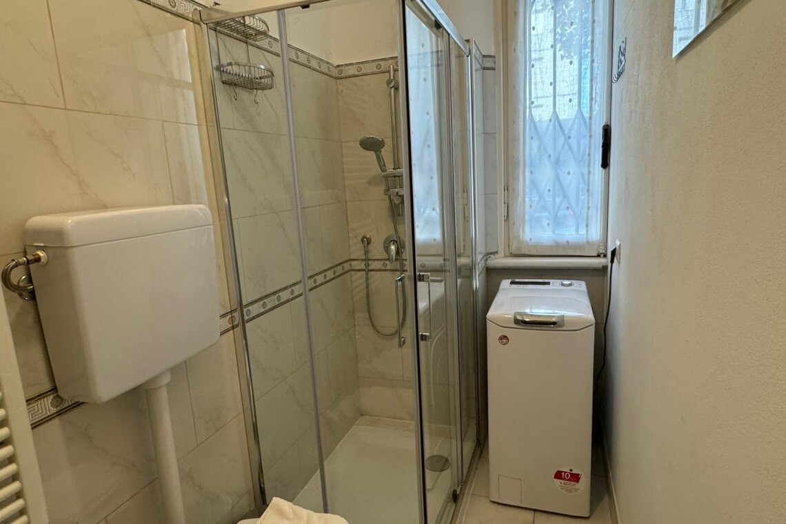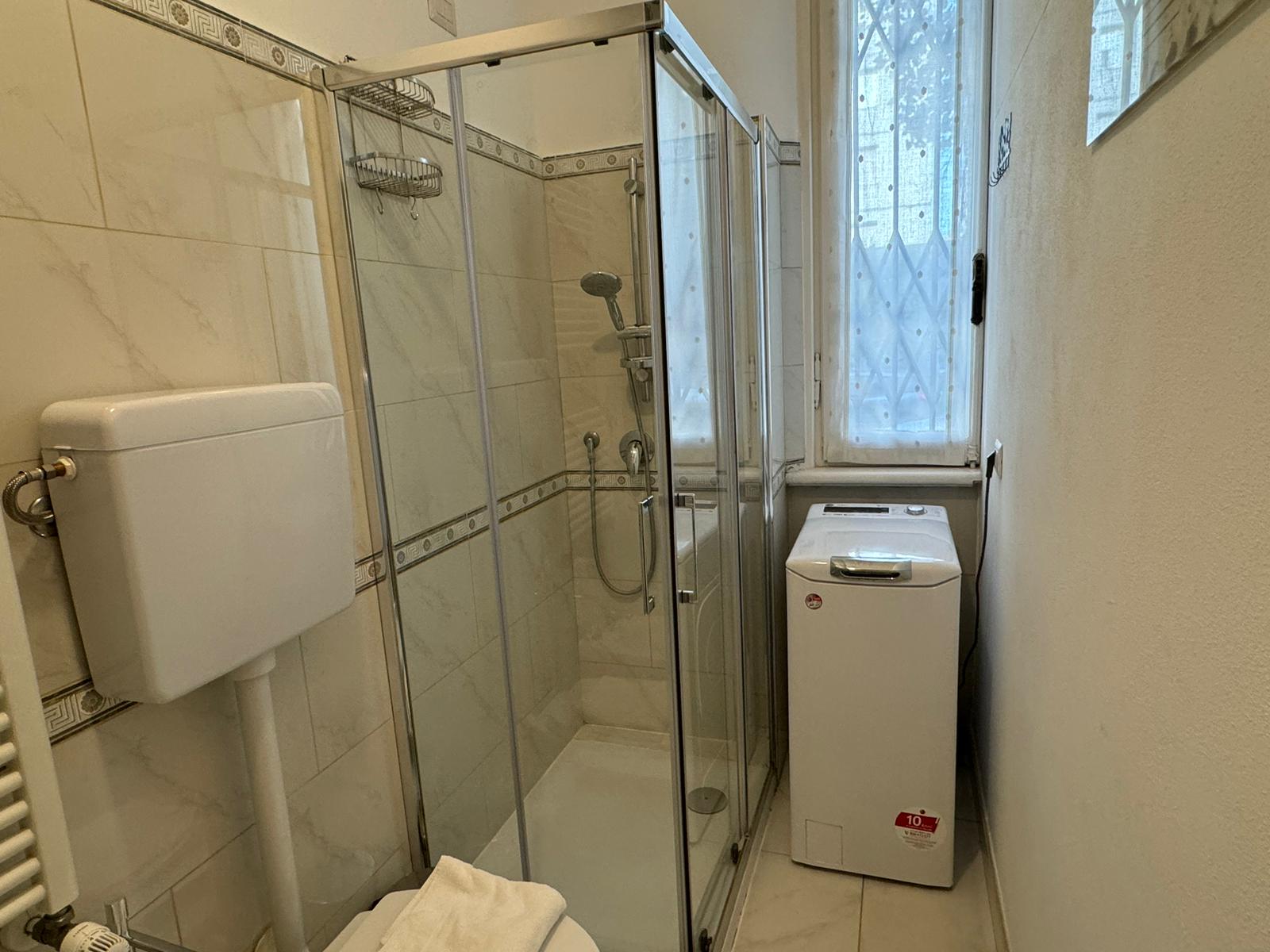 Facing the entrance, there are two rooms: a modern, fully equipped kitchen with a table and stools, and a bathroom with shower, washing machine, and window.