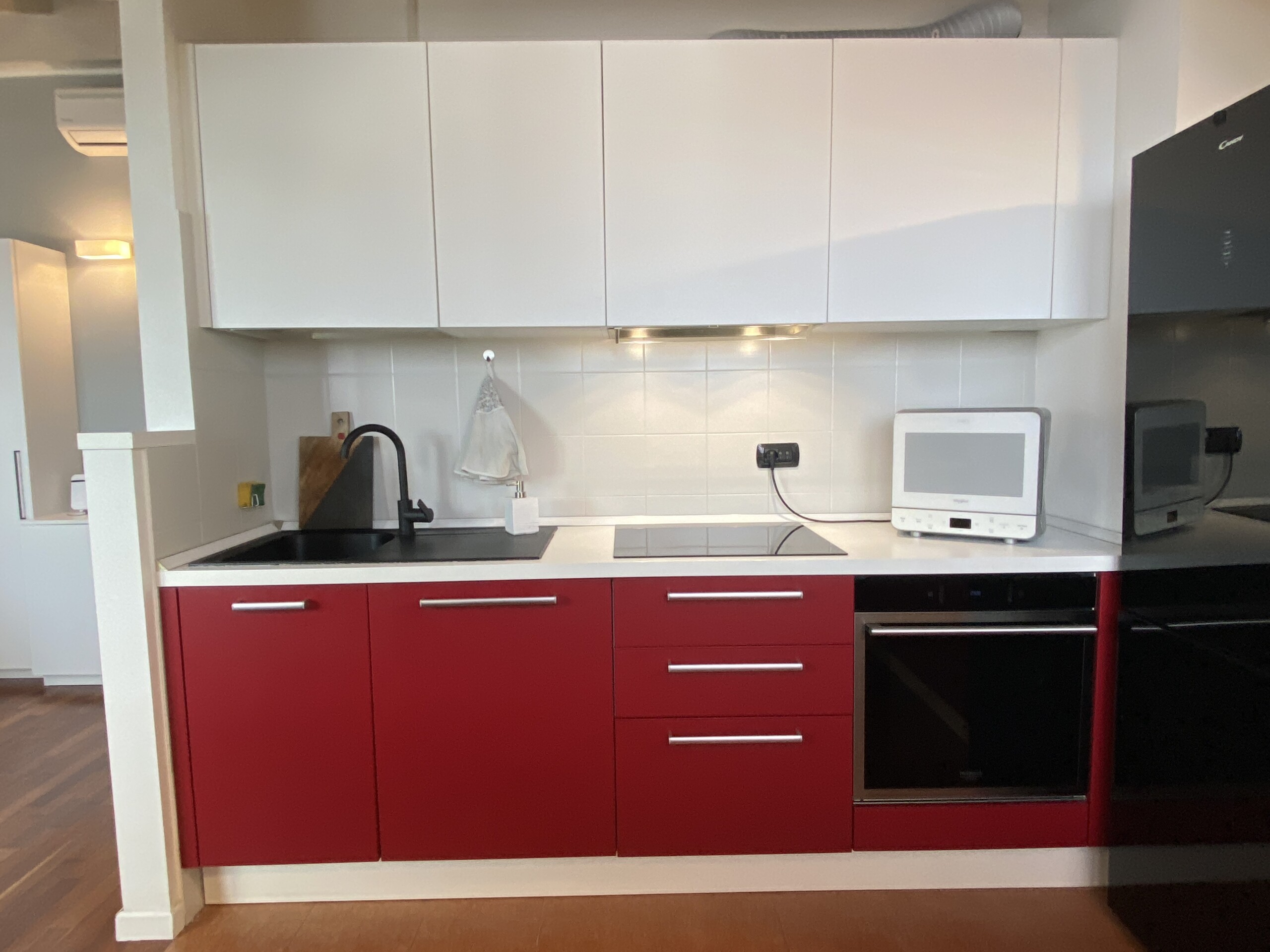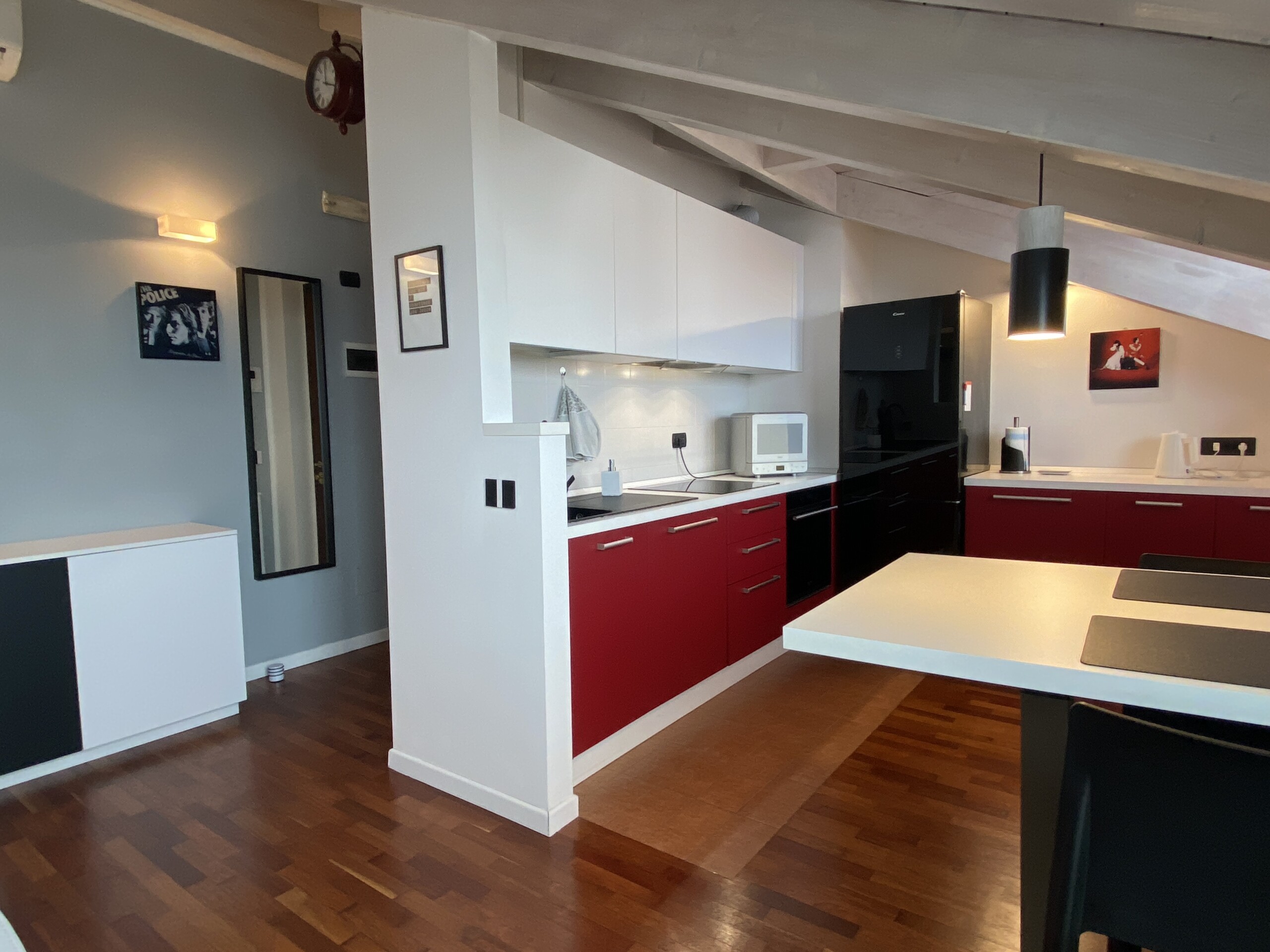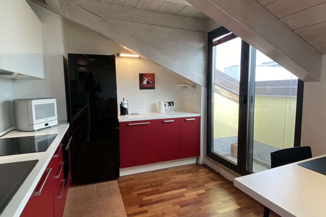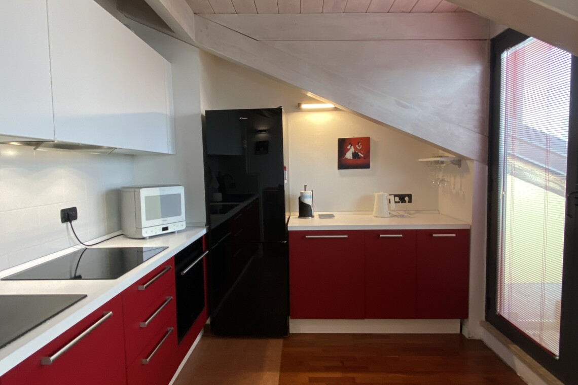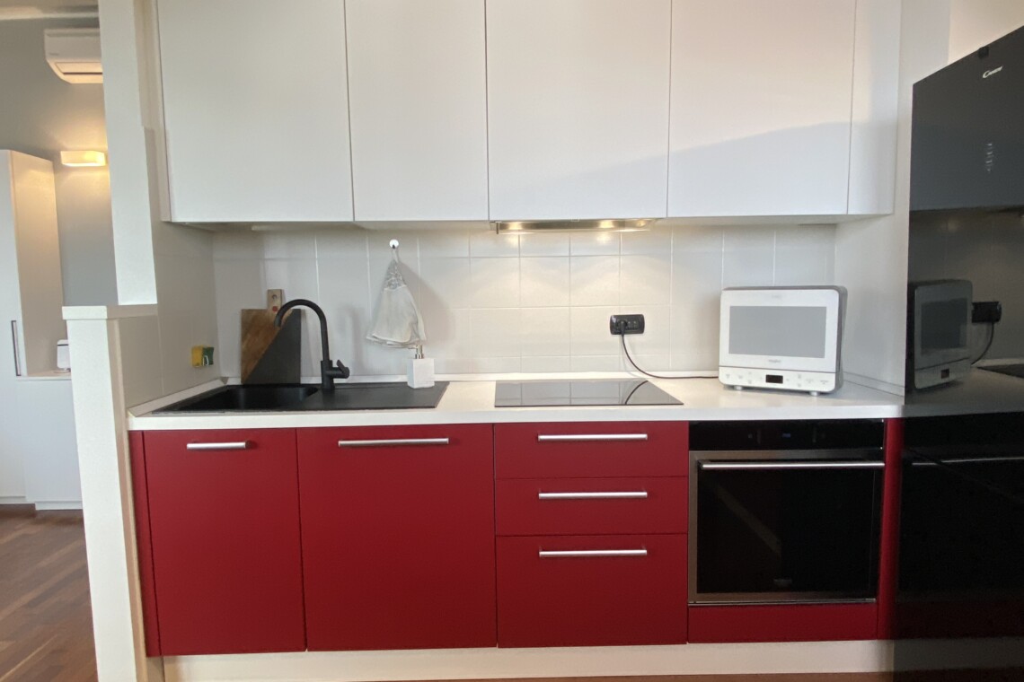 Upon entering, you’ll find a small hallway leading to the main living area, which is filled with natural light thanks to two large French doors opening onto a small balcony. The stylish red kitchen is fully equipped with an induction cooktop, electric oven, microwave, and a modern fridge-freezer, along with all necessary kitchenware. There’s a peninsula table near the kitchen and an additional table with four chairs, which can also be used as a desk.