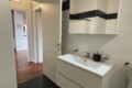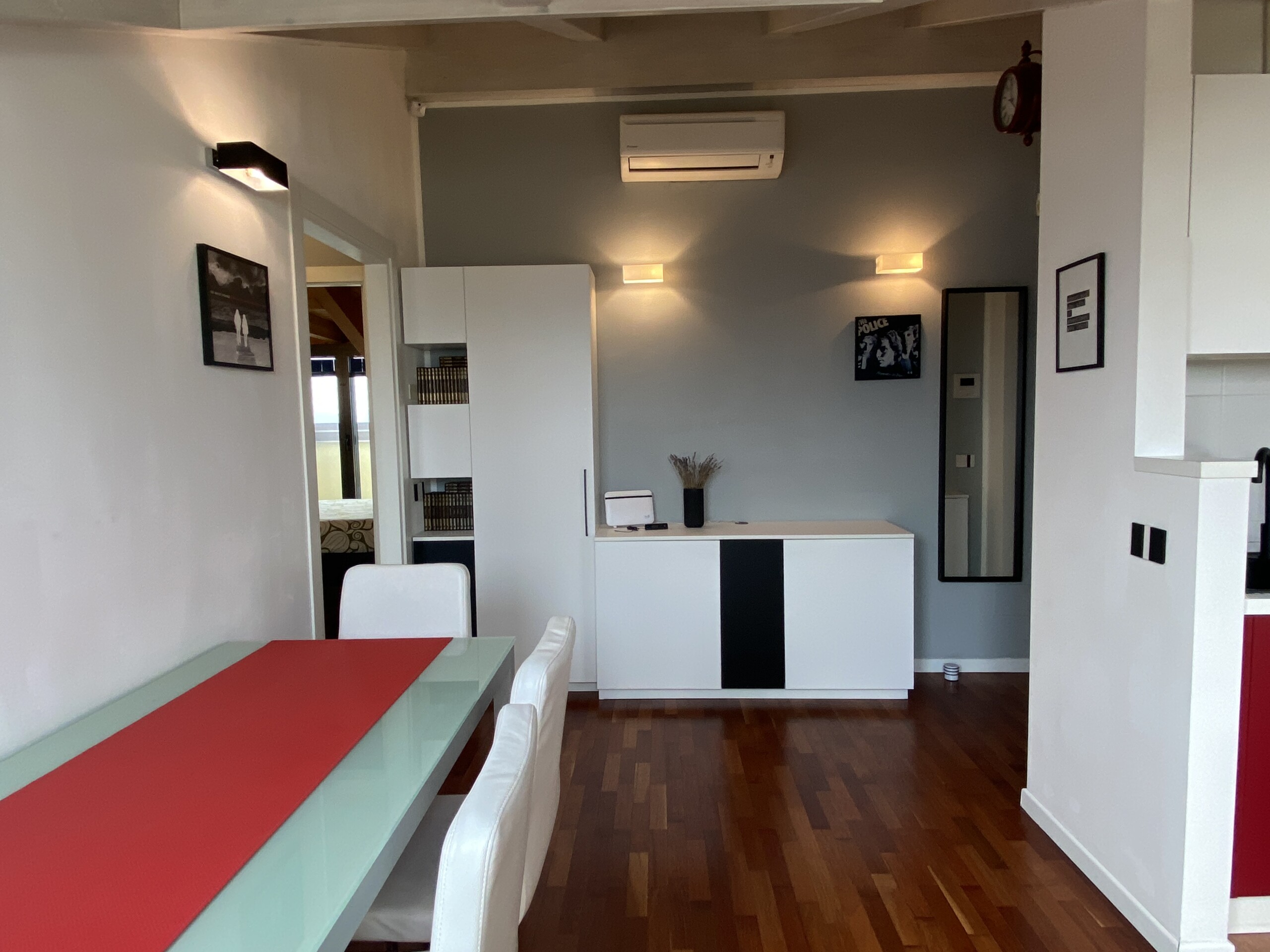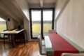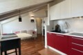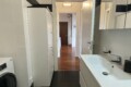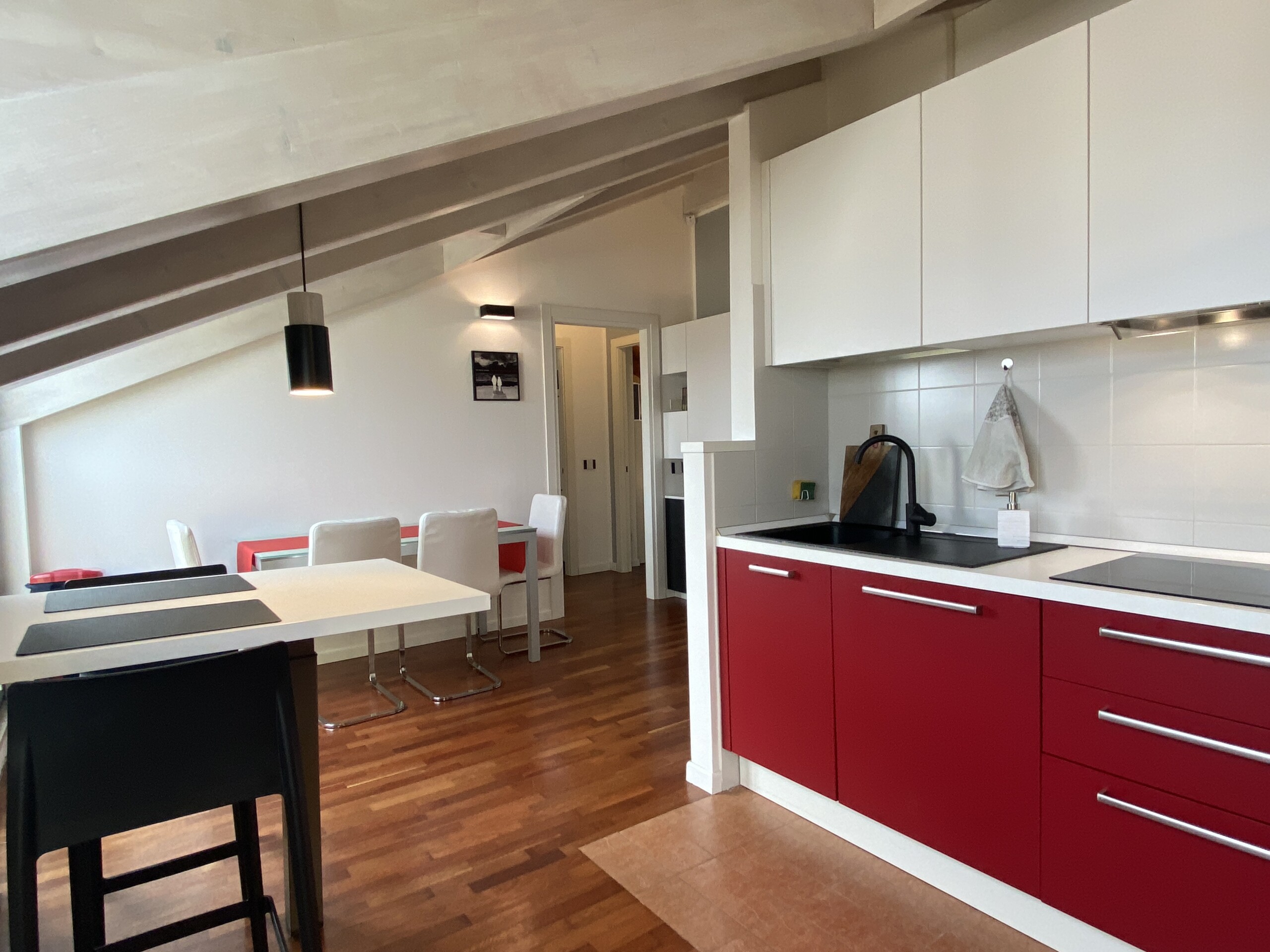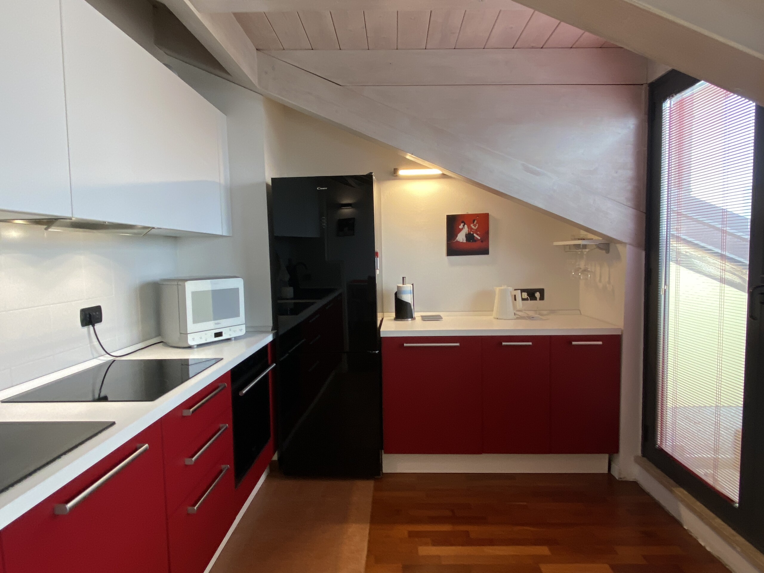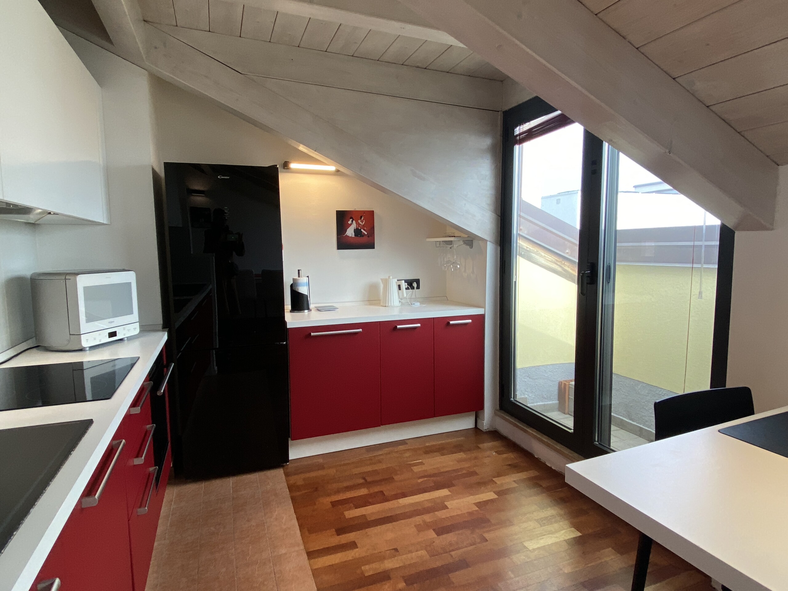 Upon entering, you’ll find a small hallway leading to the main living area, which is filled with natural light thanks to two large French doors opening onto a small balcony. The stylish red kitchen is fully equipped with an induction cooktop, electric oven, microwave, and a modern fridge-freezer, along with all necessary kitchenware. There’s a peninsula table near the kitchen and an additional table with four chairs, which can also be used as a desk.