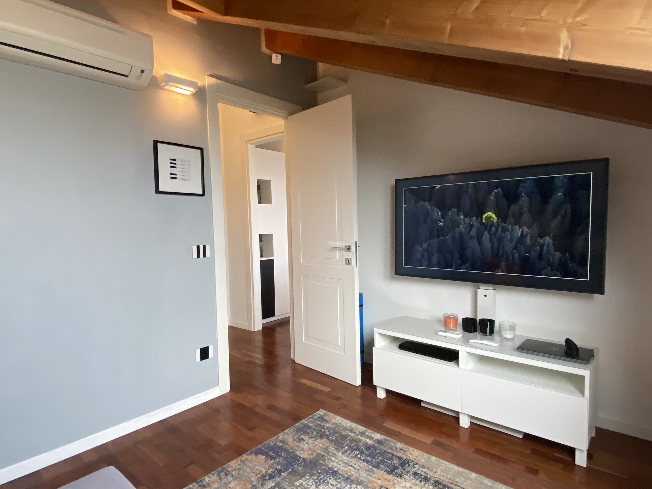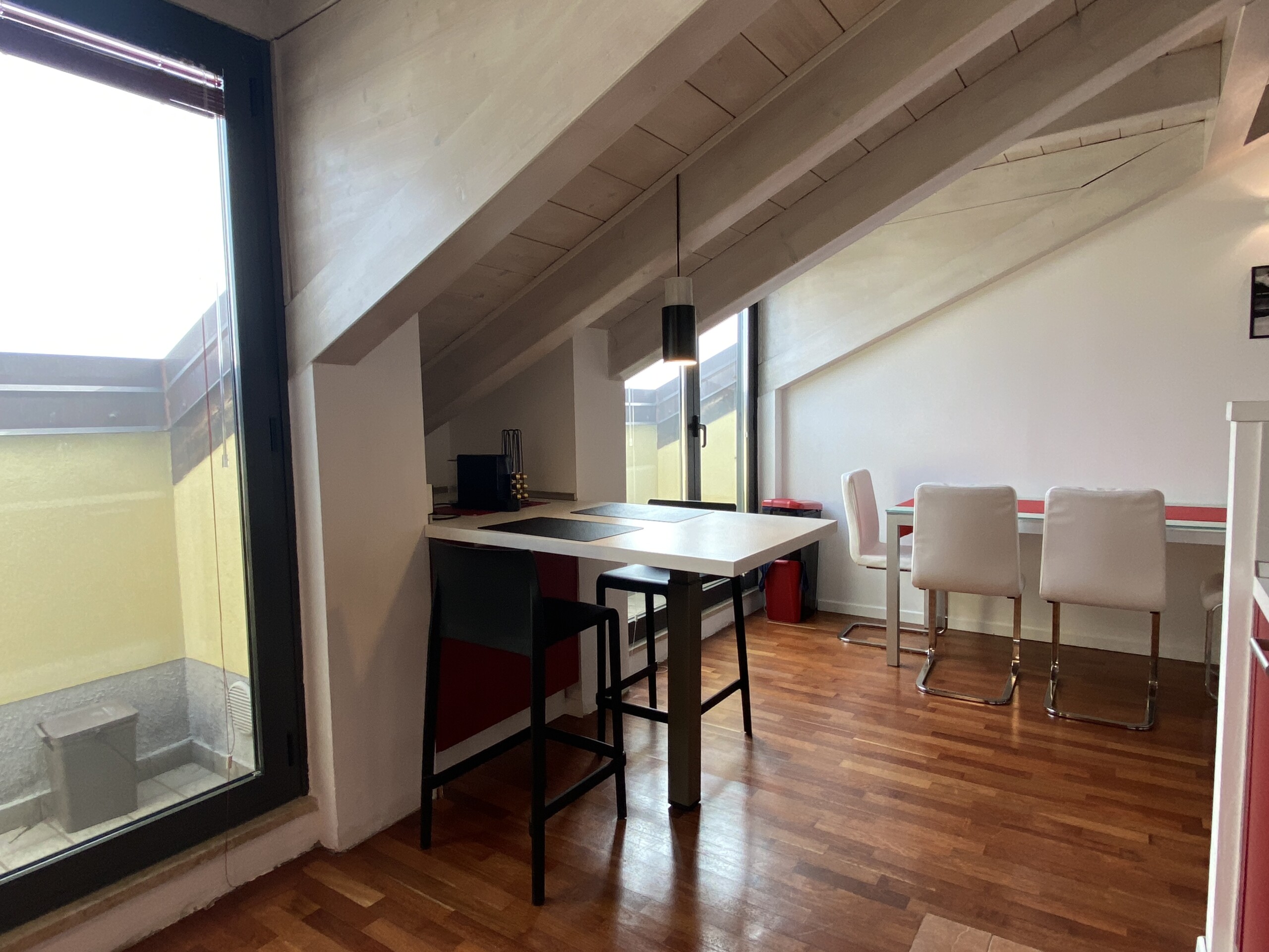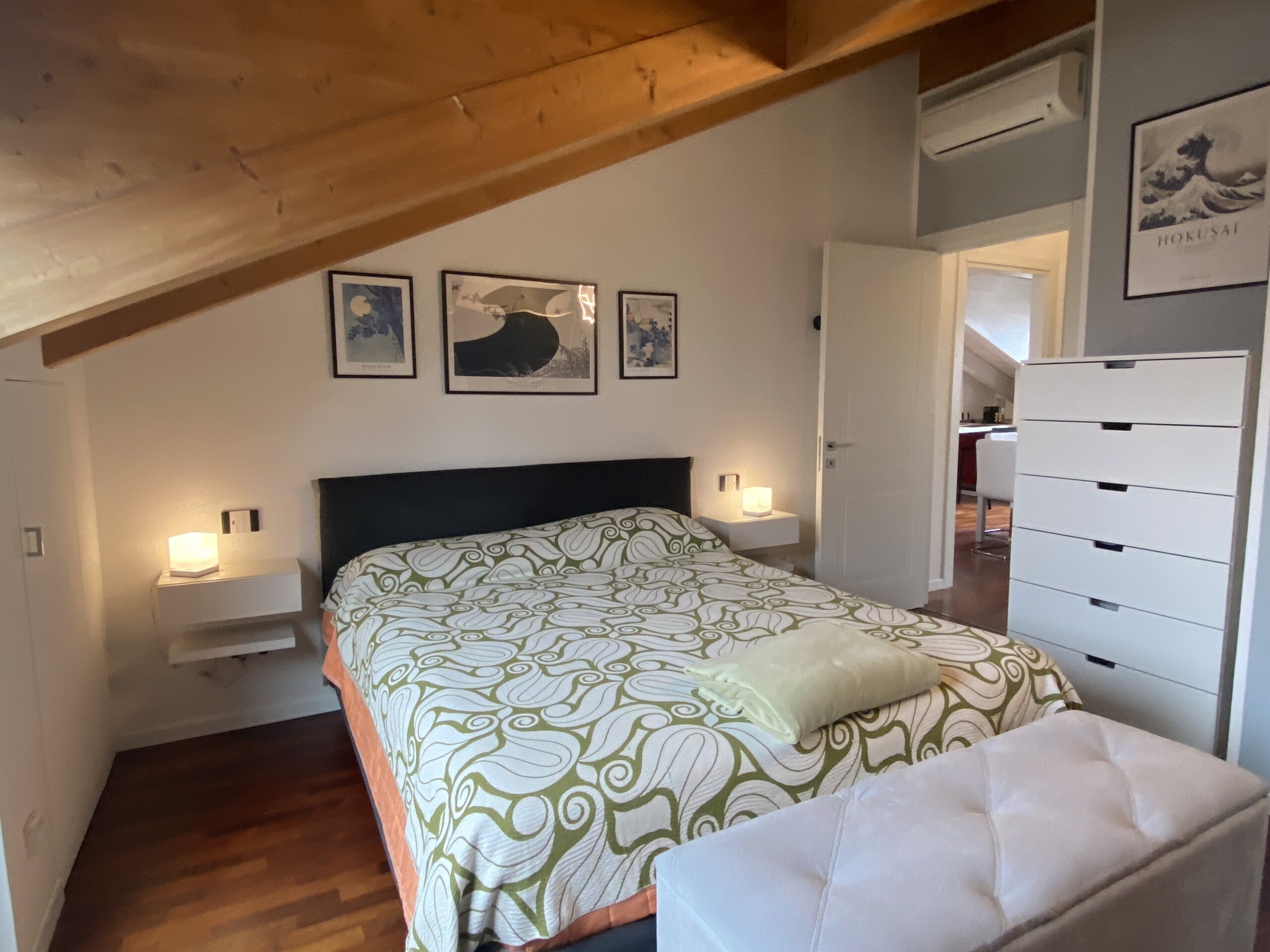 Throughout the apartment, you’ll find beautiful wooden flooring and exposed wooden beams, adding a unique and cozy touch. The windows are fitted with mosquito screens for extra comfort.