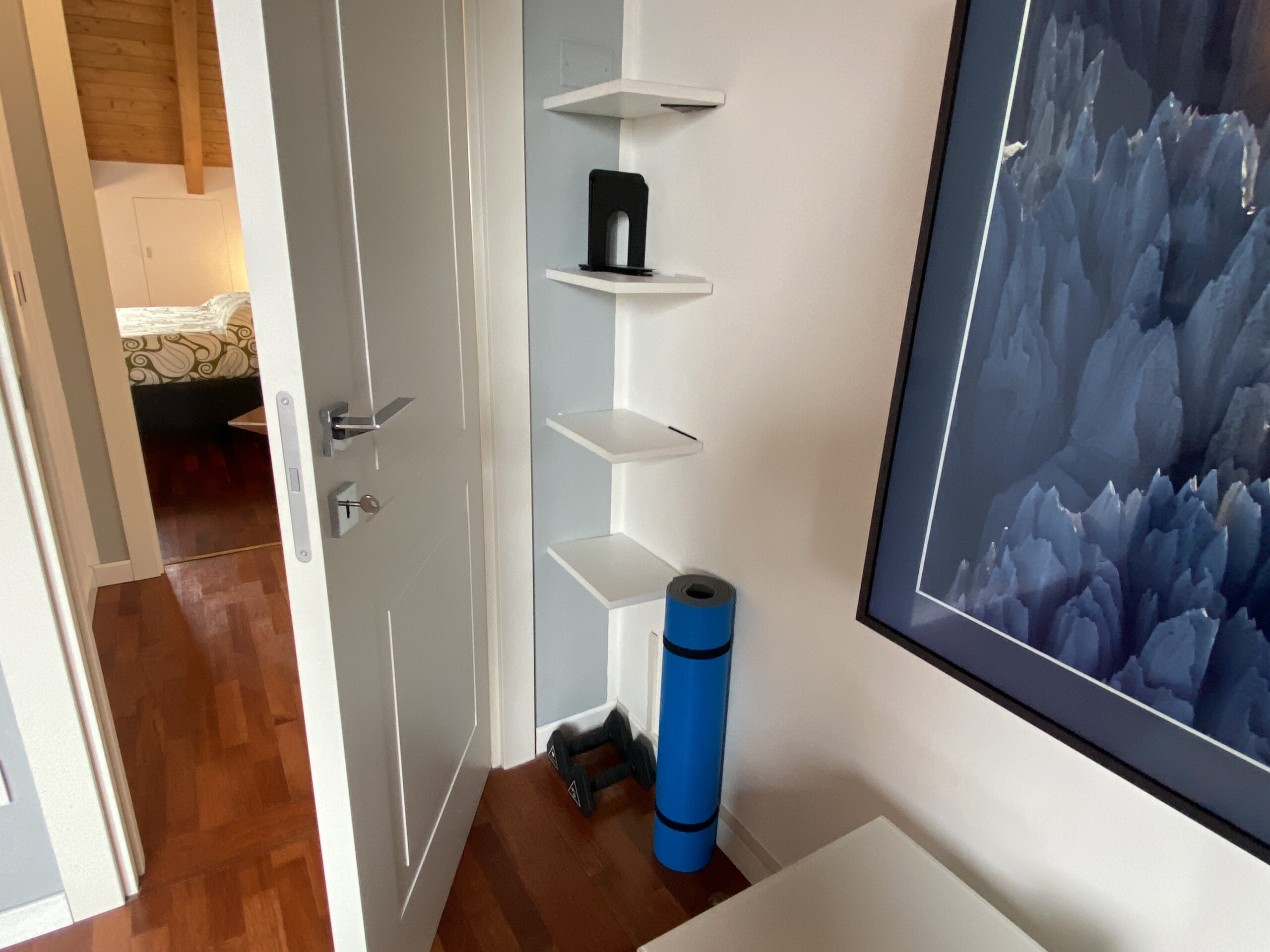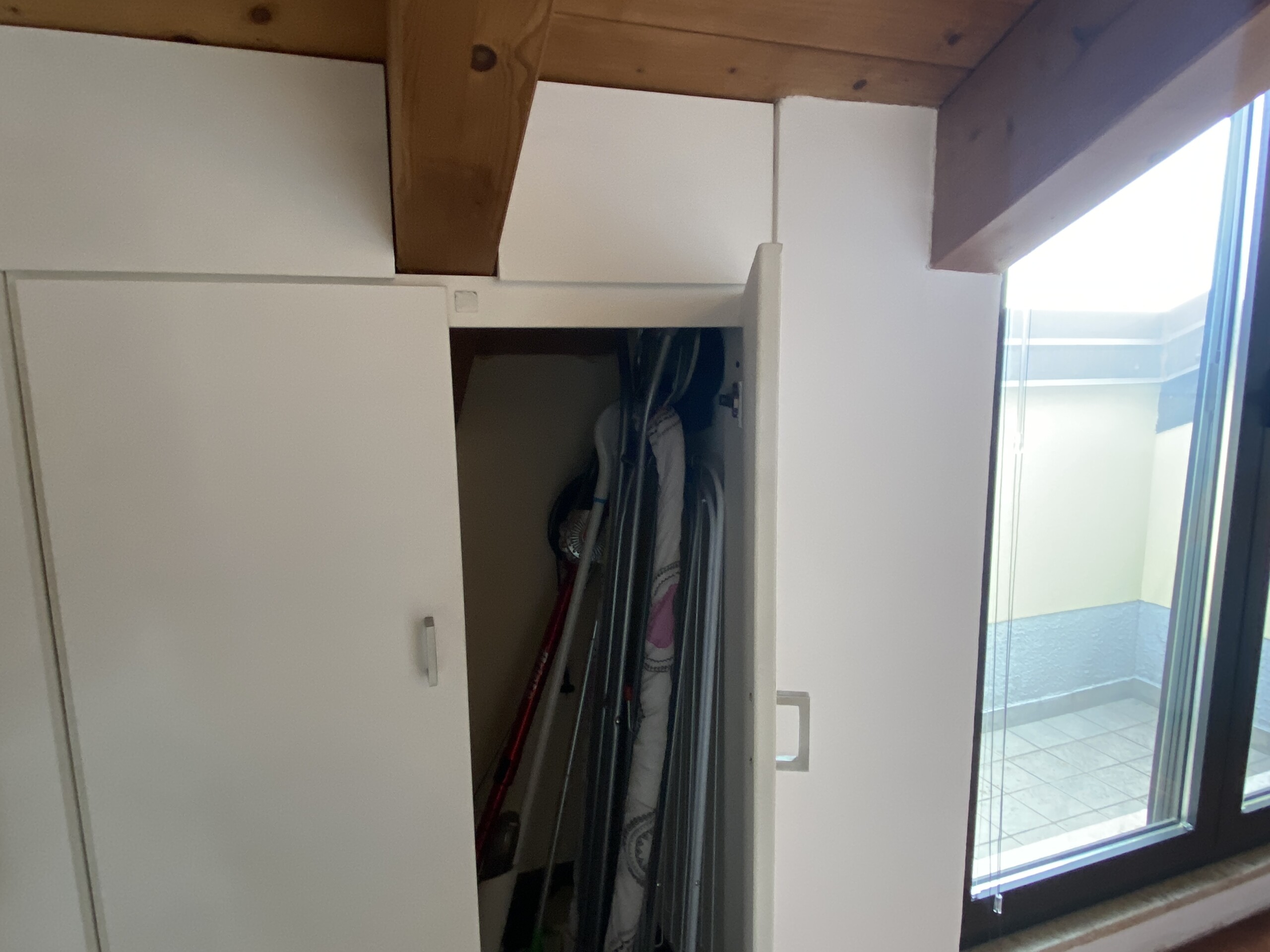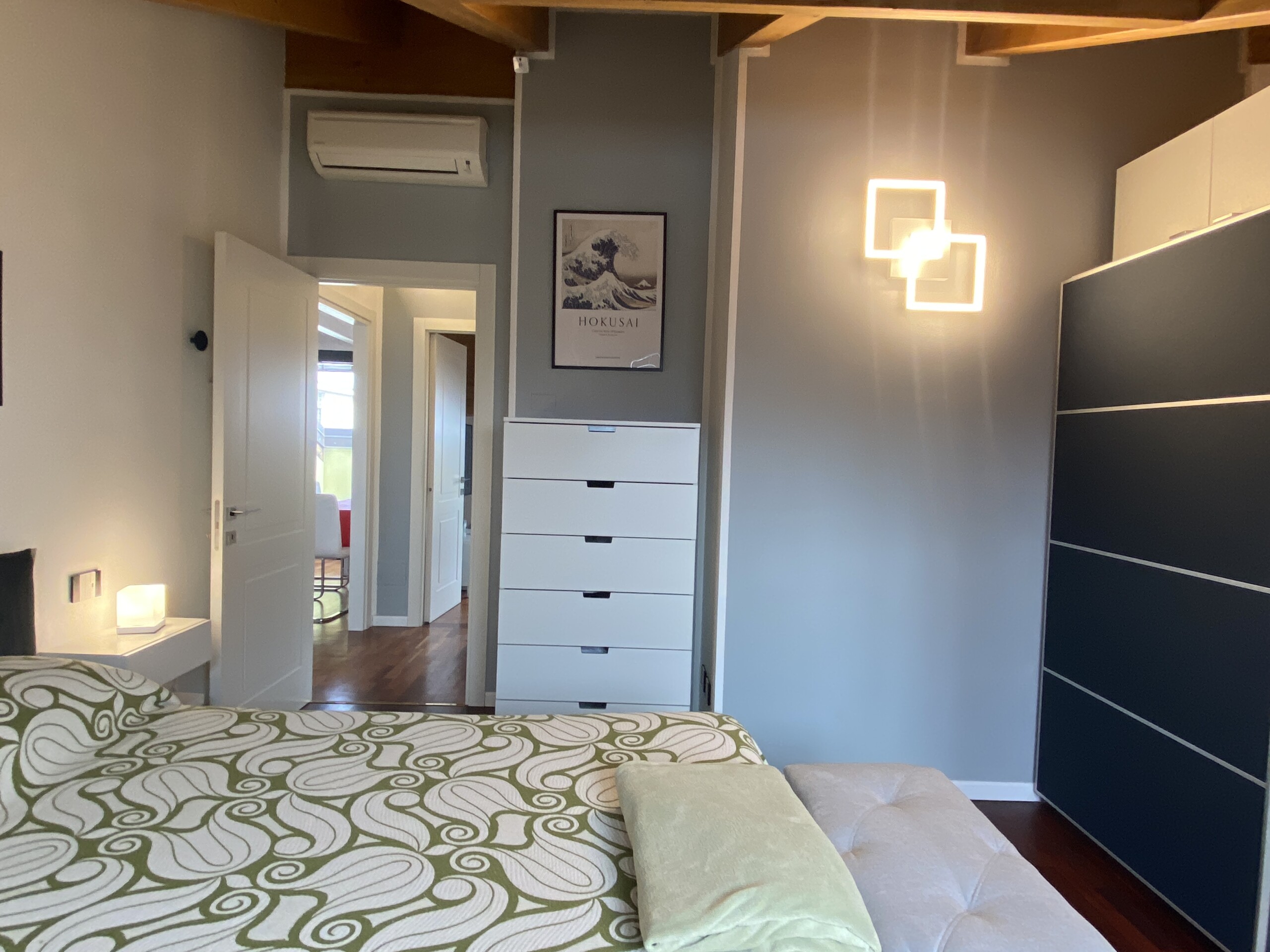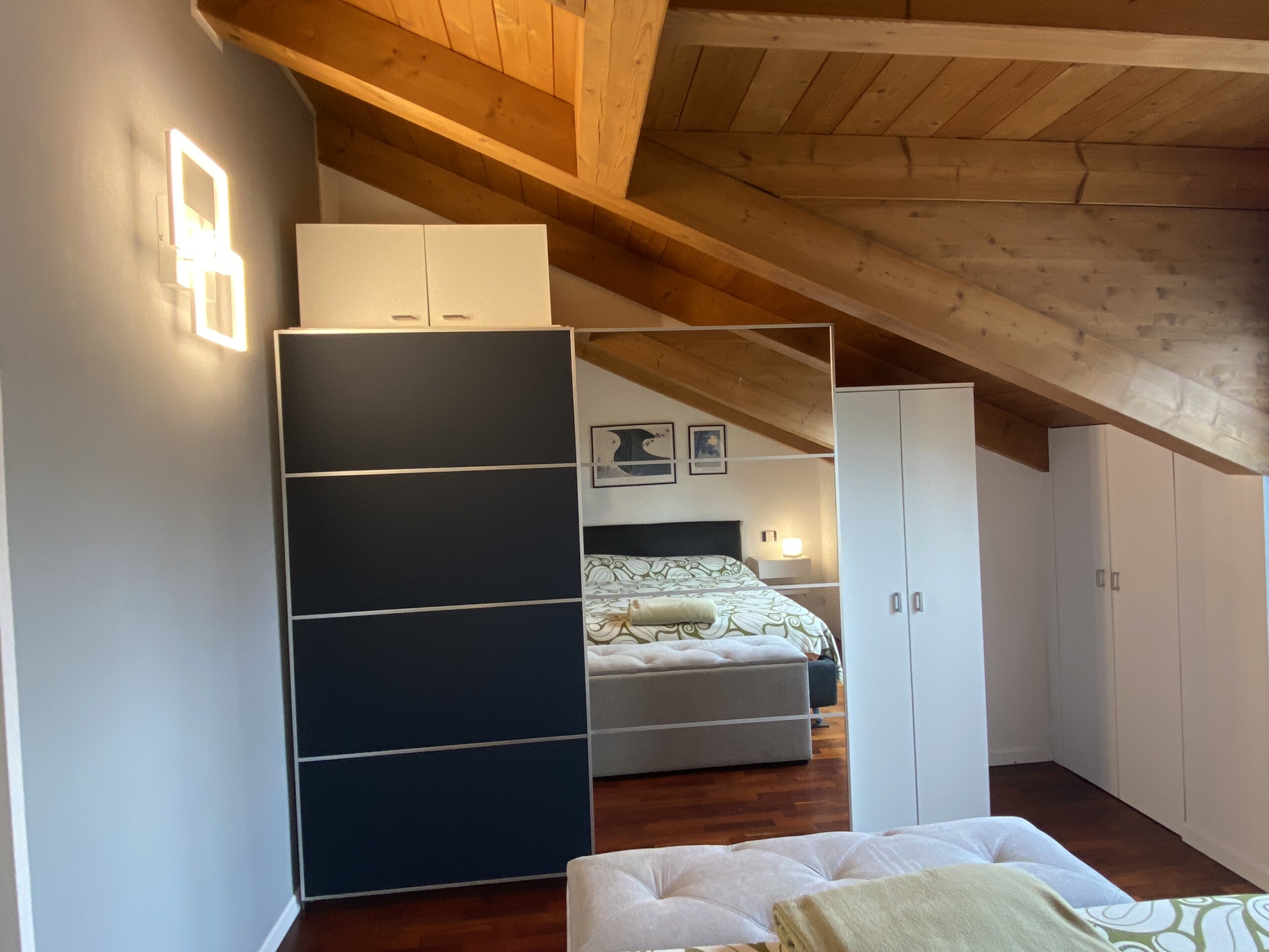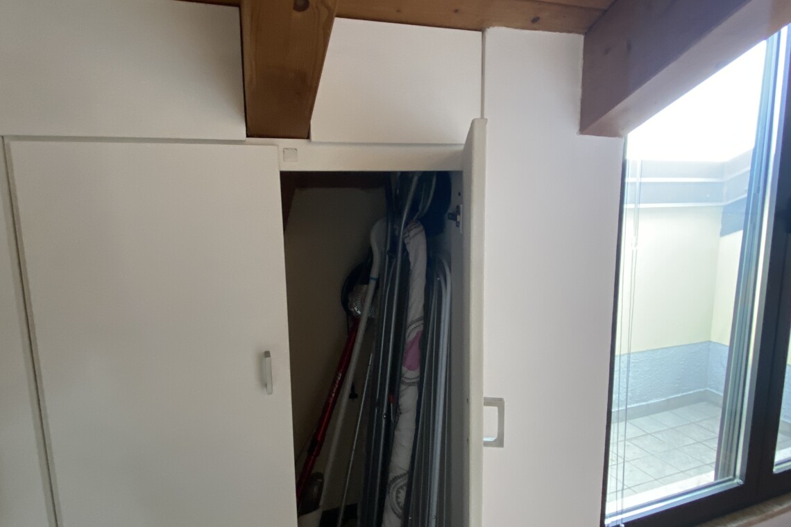 The bedroom features a double bed, a spacious wardrobe, and custom-built shelving, offering plenty of storage space for clothes, shoes, and personal belongings.