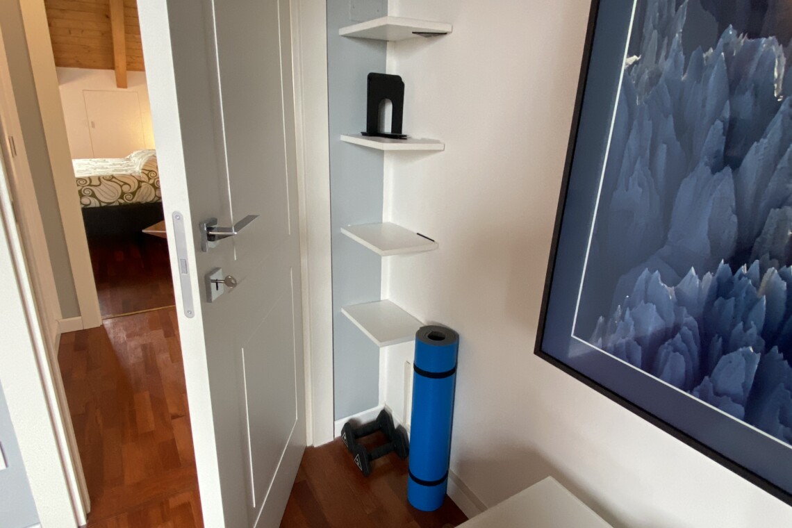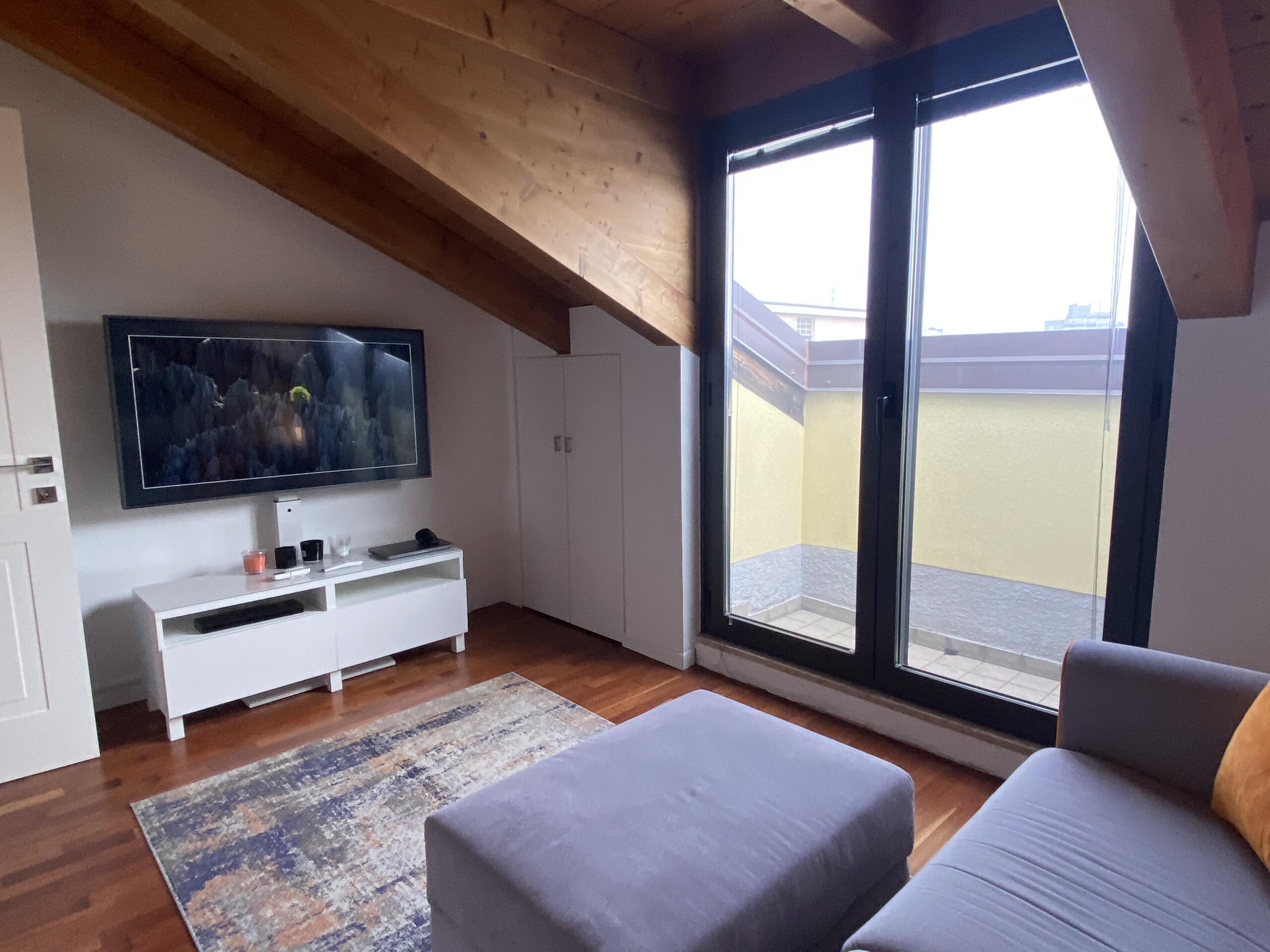 The second room is currently set up as a living room with a modern sofa and a large TV, but since the sofa is a sofa bed, this room can easily be used as a second bedroom. There is also storage space available for clothes.