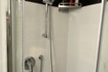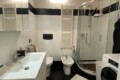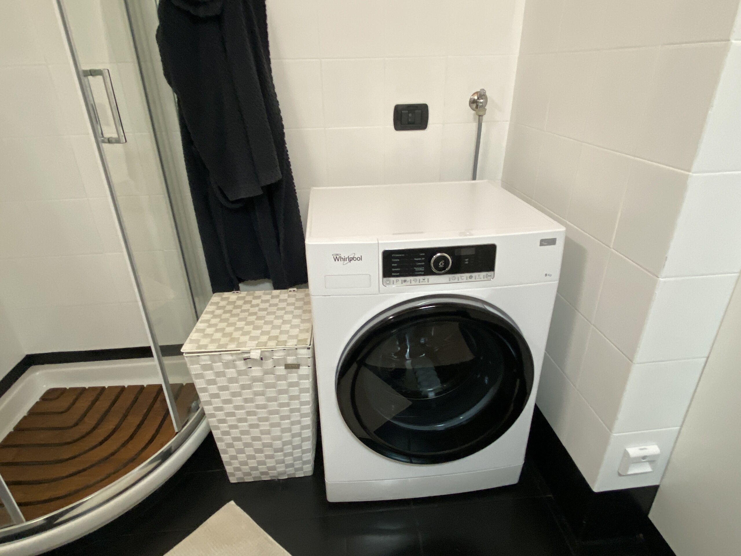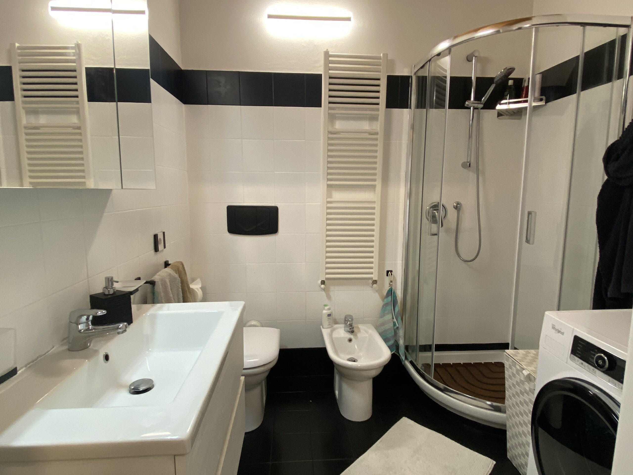 The bathroom is modern, with an extra-high ceiling, a shower, bidet, and washing machine.